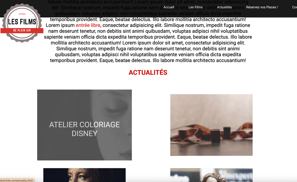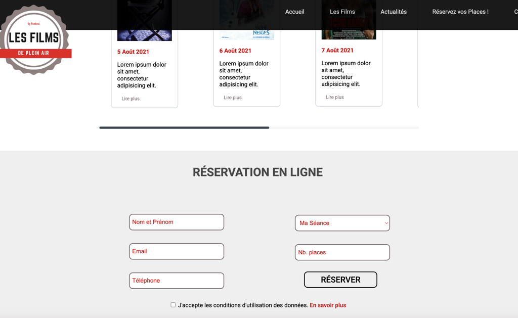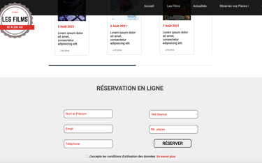 Ce projet présente le programme du festival, les films projetés, les informations pratiques et la billetterie. L’objectif était de concevoir un site simple et clair, mettant en valeur l’identité visuelle de l’événement et offrant une navigation fluide aux visiteurs.